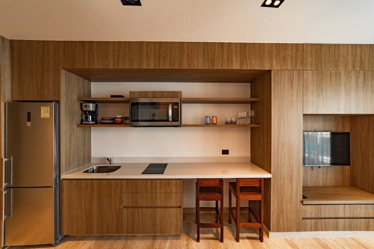 Luxus társasház Playa del Carmen szívében, mindössze néhány lépésre a híres 5th Avenue-tól és egy háztömbnyire a strandtól. Élvezd a világos és gyönyörű, teljesen felszerelt stúdiót. Pihenj és érezd jól magad az első osztályú kényelmi szolgáltatásokkal: tetőmedence, napozóágyak, szauna, pezsgőfürdő és edzőterem, hogy ne szakadj meg az edzési rutinodtól. A biztonságodat 24 órás biztonsági szolgálatunk garantálja, így nyugodt és gondtalan tartózkodást élvezhetsz.