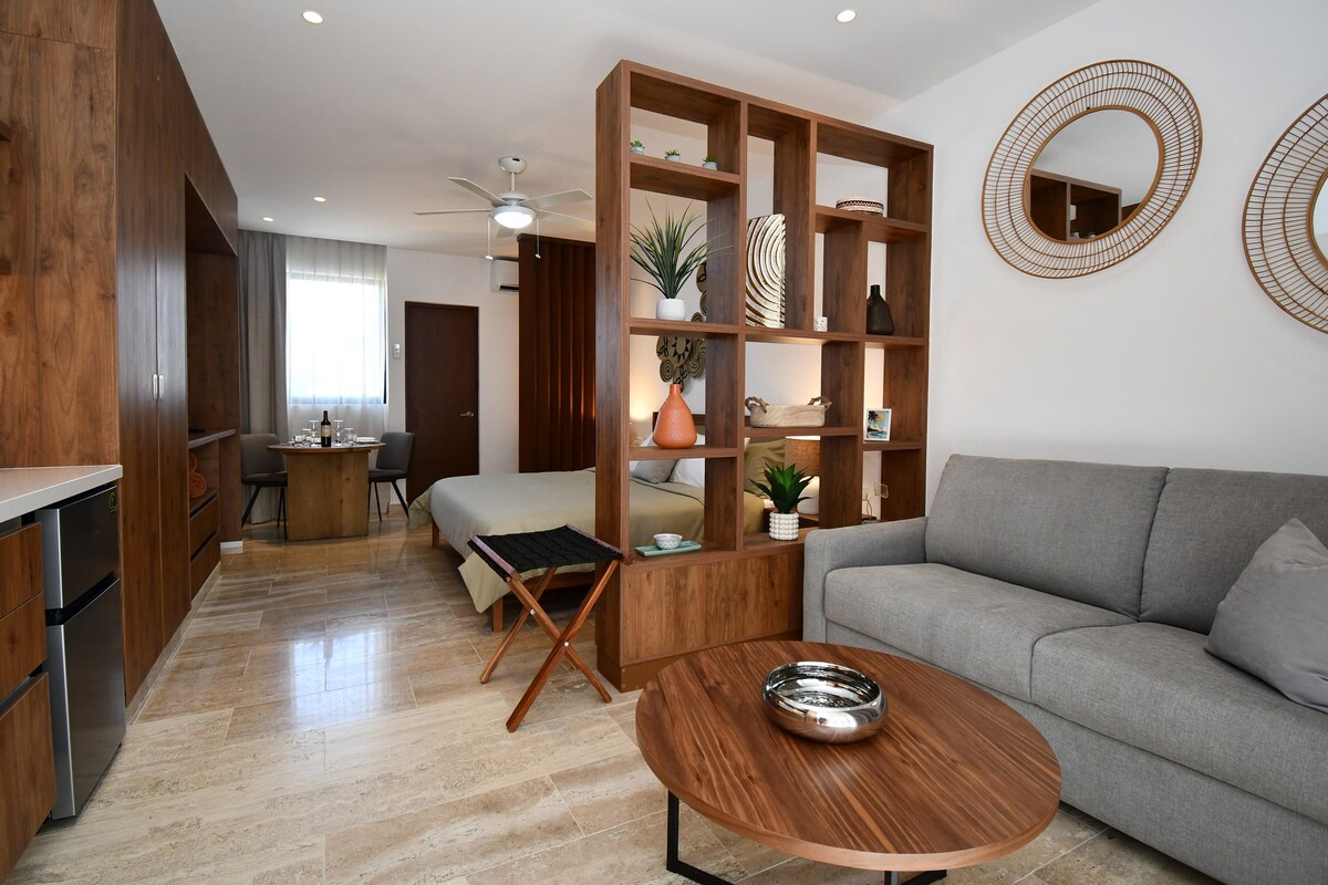Menekülj el bájos stúdiónkba Playa del Carmen szívében! Élvezd a saját medencédet, amely bármikor tökéletes a frissítő mártózáshoz. Ez a stílusos hely ötvözi a kényelmet, pár lépésre a nyüzsgő kávézóktól, üzletektől, éttermektől és a csodálatos strandoktól. Ideális pároknak vagy egyedül utazóknak, kényelmes ággyal, modern konyhával és nyugodt hangulattal rendelkezik. Függetlenül attól, hogy pihenni vagy felfedezni jöttél, ez a rejtett gyöngyszem a tökéletes trópusi menedéked.
