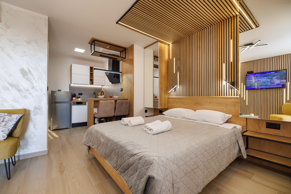 Az apartman 2000 méterre található a városközponttól és 450 méterre az első strandtól. Az apartman 44 m2-es, 40 m2-es terasszal rendelkezik, asztallal és székekkel, közvetlen kilátással a tengerre. Az apartman 1 hálószobából áll, nagy franciaággyal és egy extra kanapéval. Nappali konyhával és kanapéval (pótágy) rendelkezik. A lakás teljesen felszerelt. Ingyenes Wi-Fi. Légkondicionálás: kártyás fizetés (a működés 1 €).