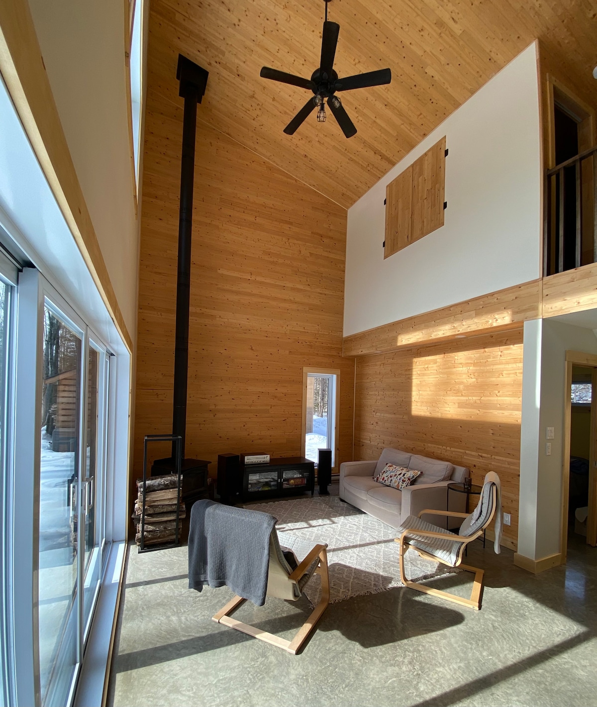 Monumental open concept, in the heart of nature. Access to trails directly behind the house. Wood stove, large modern bathroom, one bedroom + sofa bed. Another sofa bed in the living room. Ideal chalet for a couple with children or two couples. Wild birds, turkey, and deer lovers welcome! Wifi and EV charger included. Dogs Welcome! CITQ : #308038