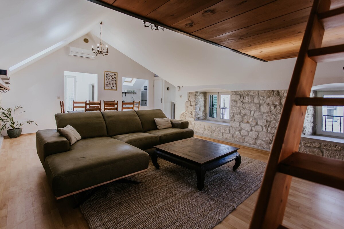 Wake beneath exposed beams of centuries old wooden ceilings. Be charmed by antique touches, industrial style stairs and fine finishes nestled behind sprawling massive internal stone arches of Imperial Palace. Steeped in history drink a glass of wine from the balcony of this unique loft after exploring Split delights, where museum pieces adorn a palette of sand and muted, earthy hues.