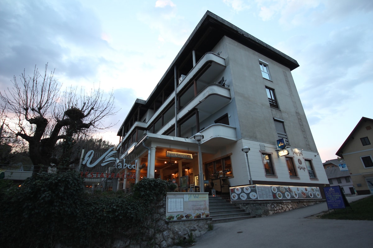 Egy tipikus szlovén alpesi ház gyönyörű kerttel a festői Spodnje Gorje faluban található, mindössze 2,5 km-re a híres Bledi-tótól. 5 vendégnek nyújt kényelmet. A vendégek a ház teljes 1. emeletét (100 m2) birtokolják, külön bejárattal. Az APP 2 queen méretű ággyal rendelkező hálószobával, 1 egyszemélyes ággyal rendelkező hálószobával, nappalival, fürdőszobával és konyhával rendelkezik.