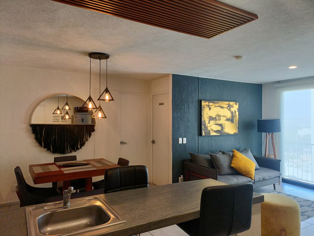 Bonito Departamento completo nuevo de lujo amueblado con vista panorámica hacia la ciudad en el piso 12, cuenta con gimnasio, areas sociales, roof garden, terraza, jardines, cancha de fútbol, estacionamiento para 2 carros, acceso con seguridad 24 horas, esta muy cerca de sams, home depot, Zoológico, a 5 min de la barranca de Huentitán, a 20 minutos del centro comercial andares, 15 min del centro, acceso a escuelas y vias de distribución principales. Pantalla de 65" wifi, netflix bien decorado