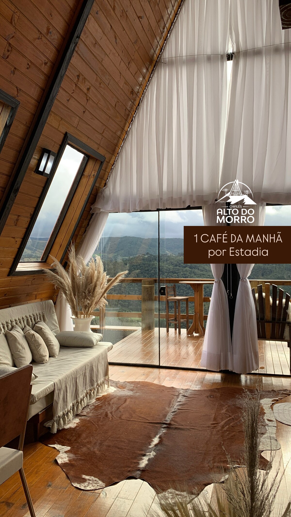 Relaxe neste lugar único e tranquilo. Hospedagem com 1 café da manhã por estadia. Chalé charmoso e confortável no estilo A-frame, localizado no alto do morro, cercado por verde com uma paisagem de tirar o fôlego e uma vista privilegiada, em frente avista-se o mirante da Boa Vista. O chalé está voltado para o oeste, ou seja para o pôr do sol maravilhoso!