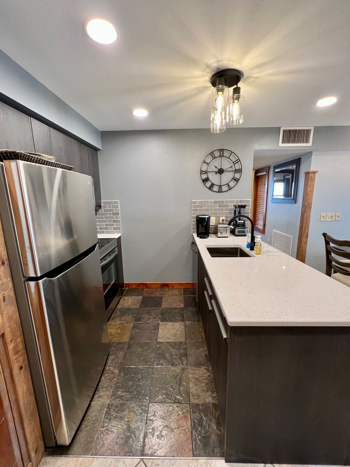 Modern meets old world charm in this newly renovated Highland House condo! Enjoy a fabulously appointed unit with many unique barnwood accents! The kitchen includes a full size refrigerator, dishwasher, microwave, toaster, coffee pot, induction cooktop and a pullout table for two. The king-sized memory foam bed is amazing and at 14 inches off the ground, is the perfect height to store unused luggage.