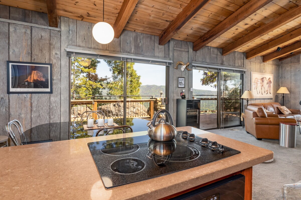 Envision a mountain retreat with a private cabin on a mountain away from it all submersed in views, trees, nature all while being 5 min. to town, shops, 17 miles to the entrance of Yosemite. Spectacular views of the Sierra Nevada mountains from the deck & inside the cabin with wall-to-wall windows that invite the view in. Experience sunrises, sunsets, nature, stargazing, fires. The cabin offers a unique experience! Unwind, reset, & soak in the views in this peaceful, romantic tranquil setting.