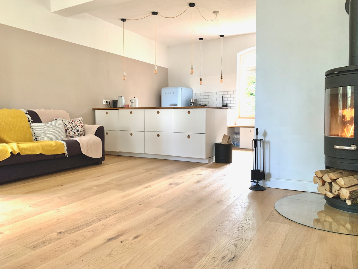Élvezd ezeknek a régi falaknak a békéjét és biztonságát. Ősi fákkal körülvéve a Mecklenburg Lake Districtben. A lakásod az 1. emeleten található, és gondosan felújították. Újraépítettük a régi agyaggyárakat, felfedeztük az ősi padlódeszkákat, és csak a legfinomabb agyagfesték került a falakra. A HideAwayt egy kis öntöttvas kandalló teszi teljessé esténként, és egy privát szauna a pálya szélén... Szeretjük a gyerekeket 🧡🌟 4 macska és 1 kutya él a farmon ;-)