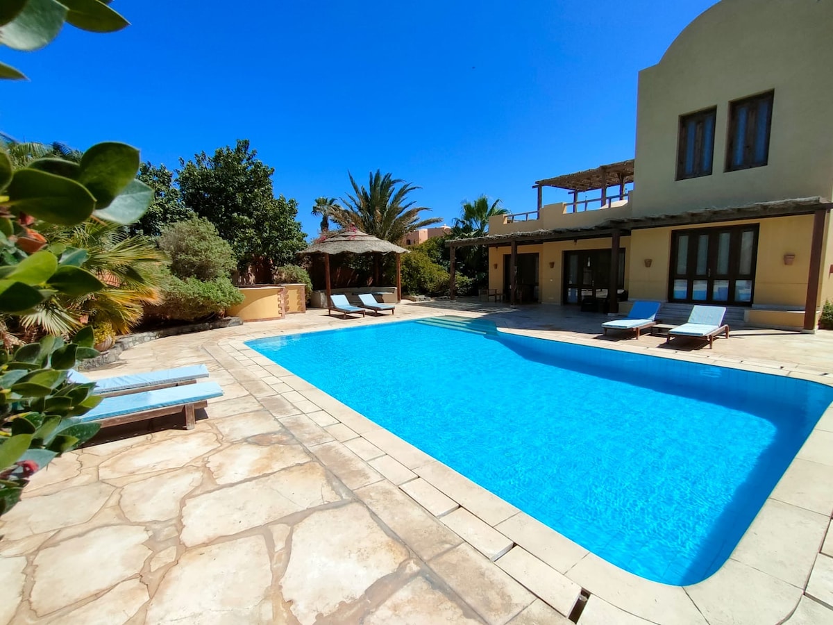 Royal Blue Villa 800m2 kert, saját medencével és jacuzzival. Kínálunk egy teljes nyaralási kezdést a reptérről történő transzferrel, kirándulásokat, amelyek mindegyike megvan, privát utazás Kairóba, Luxorba. Ússz a delfinekkel Orange Islandre? A villa mindennel rendelkezik, amire szükséged van a fantasztikus nyaraláshoz. A villa 3 hálószobával rendelkezik, és 8 vendég számára alkalmas ( extra emeletes ágy) Van játszótér, biliárdasztal, pingpongasztal és léghokiasztal