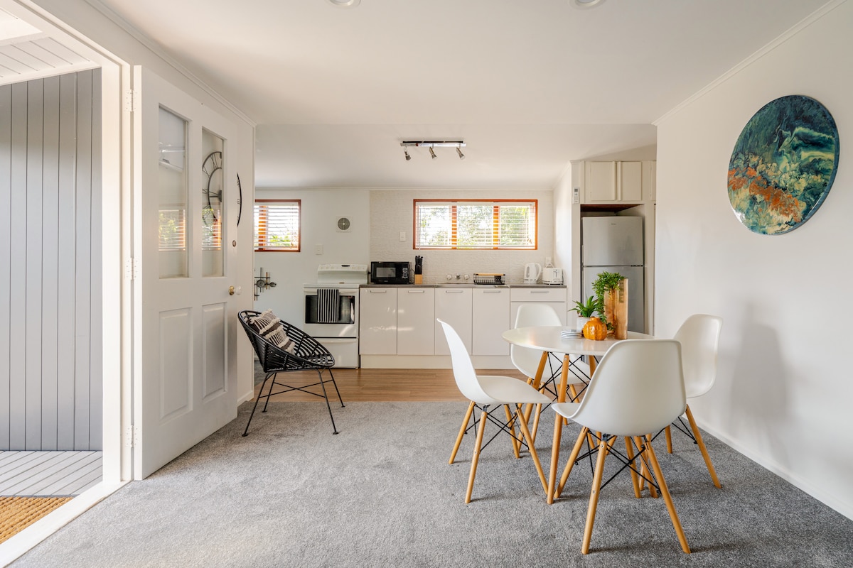 Lépj be ebbe a hangulatos, stílusos stúdióba, amely a bozótosban rejtőzik. Csukd be az ajtót, és kapcsolódj ki a világ elől… kivéve a helyi madárvilág lágy hangjait, a fantailokat, a tūī-t és a kererū-t Kezdd a napot egy kávéval, vagy lazíts egy pohár borral a saját teraszodon. Dőlj hátra a kanapén egy jó könyvvel, vagy nézd végig a kedvenc műsoraidat – ez a hely a pihenésről szól. A nyugodt kiruccanásod, amelyet a nyugalomra terveztünk. Plusz biztonságos, utcai parkolás két jármű számára.