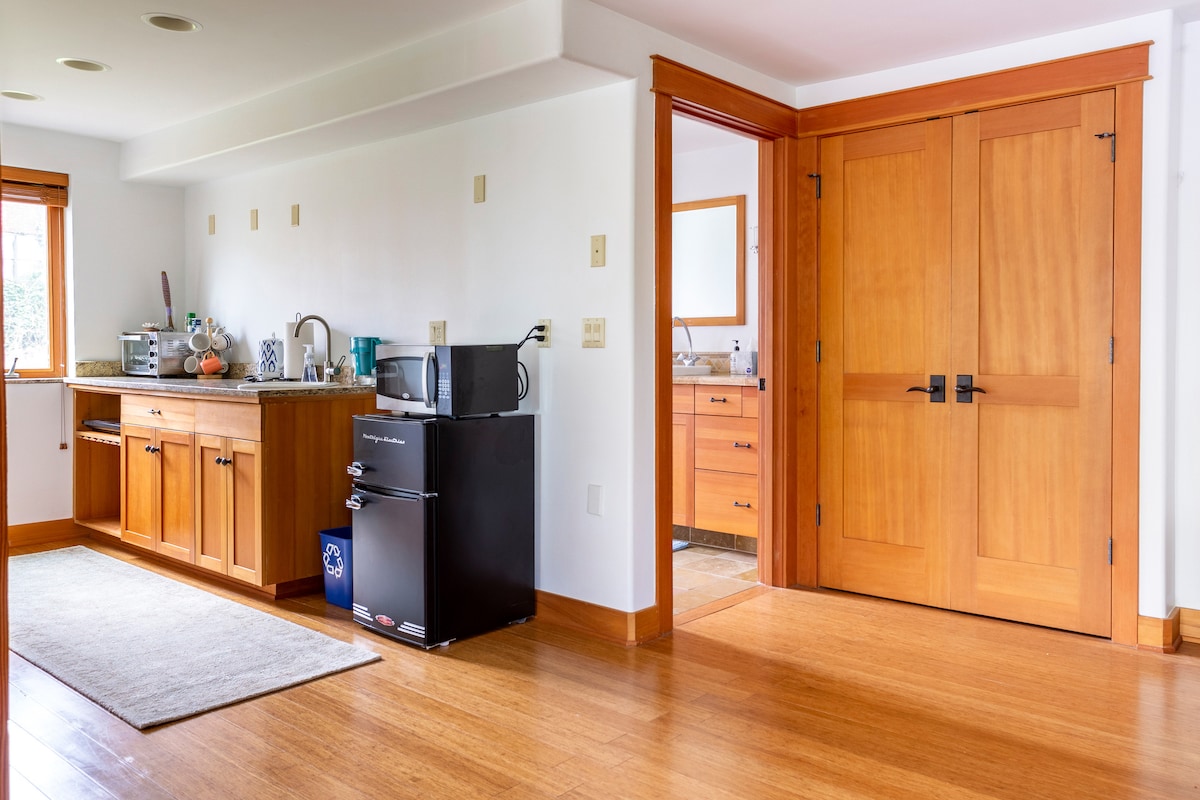 Élvezd a Reed College/Woodstock környékét SE Portlandben. Az ablakok az udvarra néznek, saját bejárattal. Modernista és antik bútorok, művészet, érdekességek és könyvek gyűjteményéből származó csecsebecsékkel berendezve. Emellett: fürdőszoba zuhanyzóval, hűtőszekrény és forró edény (nem konyha). Sétálj el a közeli természeti ösvényekre a Reed College , a Trader Joe 's & New Seasons (élelmiszerboltok), a vintage bevásárlóközpont, a Double Mountain & Gigantic sörfőzdék, a helyi éttermek, kávézók és bárok; buszvonal fél háztömbnyire.