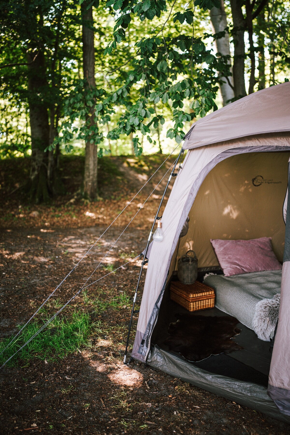 Gyönyörű sátor, kilátással a csillagokra a tetőablakon keresztül. Jó dobozmatrac 140 X 200 cm és 2 egyszemélyes ágy habszivacs matraccal Paplanok, lepedők és törölközők. Székek, asztalok és kiszolgálás. Vízforralók, valamint kávé- és teafőzési lehetőség. Fürdőszobák és mosdók az udvaron. Tűzrakóhely, és lehetőség főzni és tüzet gyújtani a rácson. Grill és kemping tűzhely. Szauna hideg vizes edénnyel és jó olajokkal – 250 kr Reggeli 120 kr Vacsora 150 DKK Kis bolt az udvaron, ahol italokat, fagylaltot, harapnivalót lehet venni.