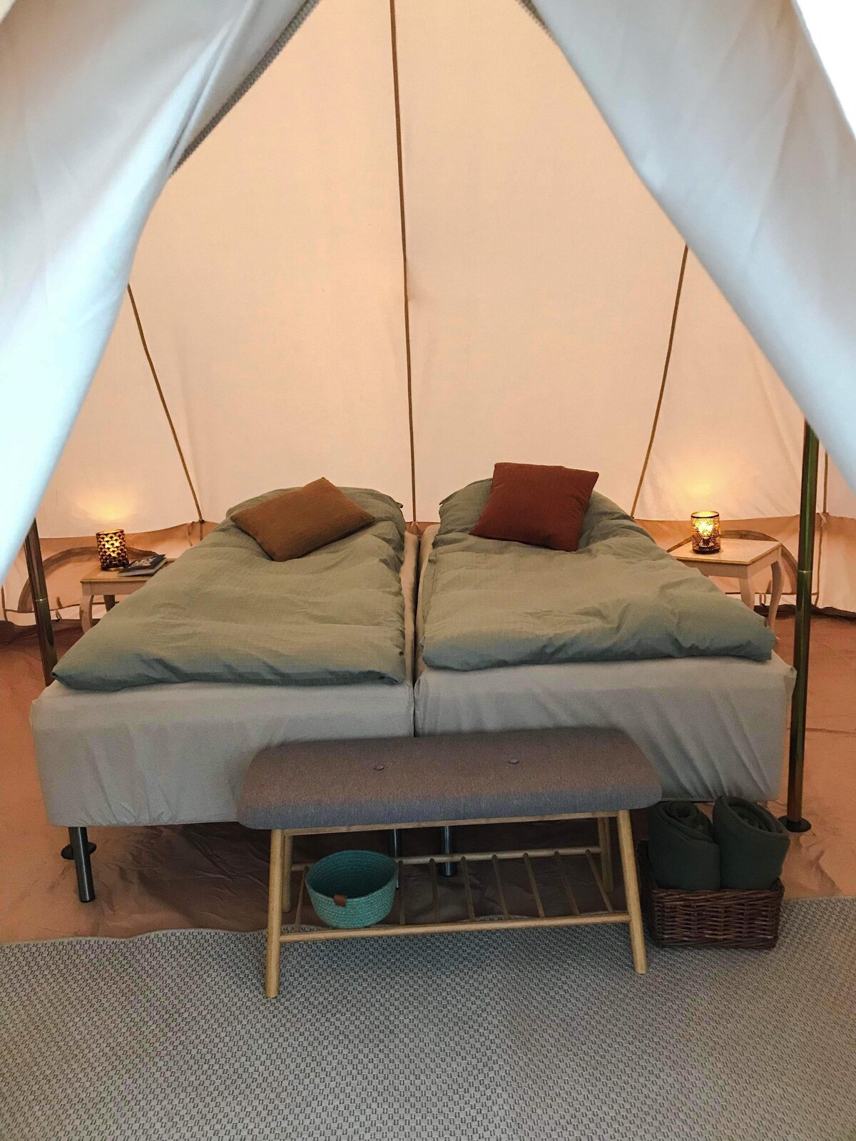 Luxuskemping egy nagy, idilli kertben, csendes környéken, ahol minden madárdal hallható, és a lehető legjobb módon pihenhetsz. Maga a sátor tágas, és luxust sugároz két jó ággyal, egy gyönyörű székekkel, asztallal és szőnyegekkel, illatos gyertyákkal és lágy világítással rendelkező társalgóval, amely kényelmet biztosít a testnek és a léleknek. Van egy szép szabadtéri terület is két székkel és egy asztallal, ahol békésen és csendben lehet élvezni az estét. Kérjük, érdeklődj a reggeli és vacsora csomagokról.