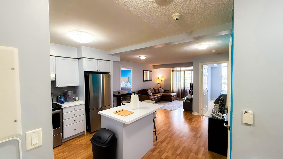 Békés menedék lélegzetelállító kilátással: pihenj és lazíts ezen a gyönyörűen berendezett Airbnb-szálláson. Élvezd a lenyűgöző kilátást a saját privát oázisod kényelméből. Kiváló elhelyezkedésünknek köszönhetően rövid sétára vagy a népszerű szolgáltatásoktól, például a Superstore-tól, a Wal-Marttól, a Dollaramától és az LCBO-tól. Emellett exkluzív hozzáférést kapsz az edzőteremhez, a szaunához és az ingyenes mélygarázshoz. Gyermekek számára nem megfelelő. Cégjegyzékszám: 25-126558