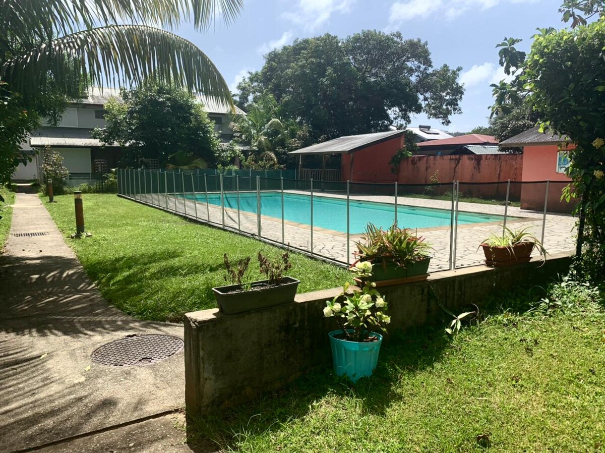 Nagyon szép, légkondicionált stúdió, teljesen felszerelt terasszal, nagyon csendes, az 1. emeleten, egy biztonságos tartózkodási, található Chemin de la forrás Baduel között Cayenne és Rémire-Montjoly. Úszómedence, parkolóhely. Közel minden kényelmi, egyetemi és kórházi.