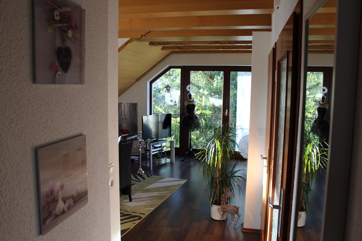 Hangulatos és berendezett, sok szerelmes lakással a régi, félig fagerendás házban. Külön bejárat, napsütötte terasz... itt csak a madarakat „zavarjuk”. Az ingatlan egy zsákutca végén található, az erdő és a rétek közepén. Nagyszerű túrázóknak és kerékpárosoknak, menj ki. A ház mögötti nagy kertben a napsütésben pihenhetsz, amely alatt a diófa kényelmesen ül, használd a szaunát (10,- a közművekhez), vagy befejezheted a napot a tábortűznél!