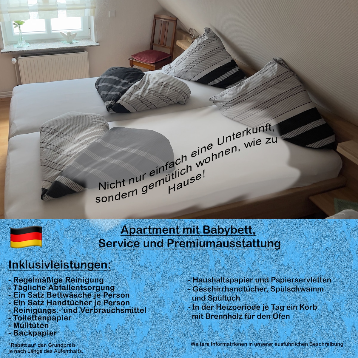 In unserer gemütlichen Imme mit Blick ins Grüne kann man herrlich die Seele baumeln lassen. Das kleine aber feine Holzhaus besticht durch den Bambusparkettboden und die großzügige Terrasse. Neben einer Filterkaffemaschiene befindet sich in der Küche auch eine Senseo Kaffepadmaschine. Eine 11KW Wallbox zum Laden eures Elektroautos steht auf dem Gelände zur Verfügung (Abgerechnet wird der Strom mit uns)