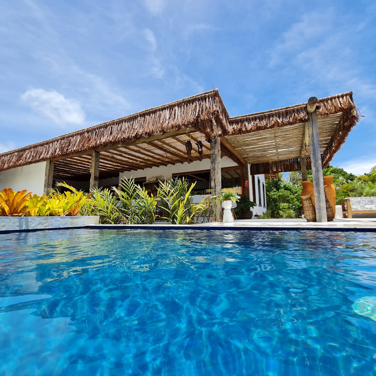 Éld át egy Bahian-ház élményét, amely Vila do Outeiro legjobb pontján található, a tengerpartra leereszkedő ösvény sziklarezervátuma előtt, ahonnan lenyűgöző kilátás nyílik a tengerre. A luxus az egyszerűségben rejlik, Bahia déli részének építészetének részleteiben, ahol a mesterek intenzíven használják a fát az ablakokban, az oszlopokban és a tetőtámaszban a terasz padlóján. Egy ház a tulajdonos által létrehozott dekoráció otthonosságával, hogy üdvözölje a családját, a barátait és most a vendégeinket.