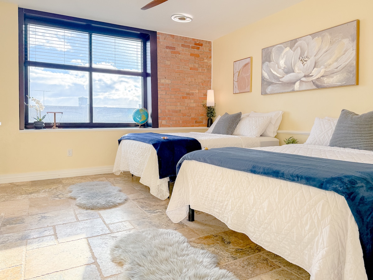 Lenyűgöző kényelmi szolgáltatások a belváros szívében! A legjobb éttermek, helyi üzletek és a folyó közelében. Könnyen megközelíthető az autópályáról, és ingyenes a parkolás. A lakosztály teljesen felszerelt konyhával és vadonatúj készülékekkel rendelkezik. Luxus zuhanykabin és századfordulós mosdó díszíti a travertin csempézett fürdőszobát. Élvezd a gyors üvegszálas internetet, hogy otthonról dolgozhass, vagy filmeket streamelhess egy kényelmes ágyról a 65 hüvelykes tévében, és minden alkalmazás előre telepítve legyen. Ingyenes kávé és zenegép az előtérben és flipper a mosókonyhában.