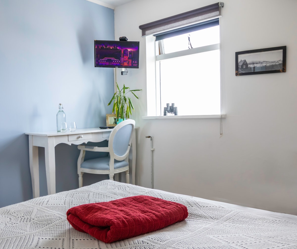 Hangulatos kétágyas szoba a Kék Ház felső szintjén, kilátással a híres Snaefellsnes-vulkánra/ gleccserre. Kétszemélyes vagy kétszemélyes ággyal, Netflix TV-vel és íróasztallal felszerelt. A fürdőszoba és a konyha közös használatú. A kontinentális önkiszolgáló reggelit házi készítésű kenyérrel lehet lefoglalni személyenként 15 euró felár ellenében.