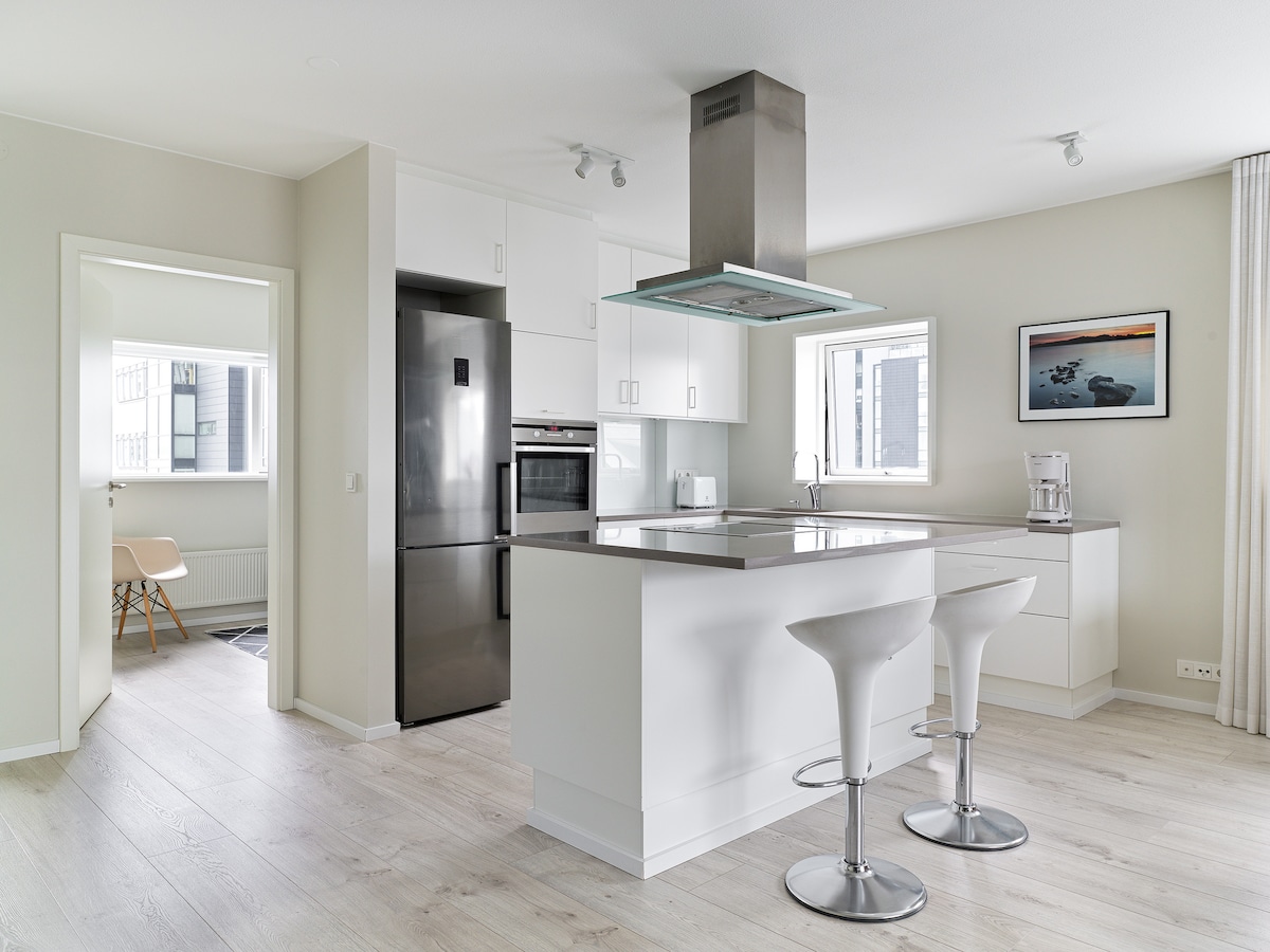 Gyönyörű és tágas lakás egy csodálatos helyen Reykjavík belvárosában. Ingyenes privát parkolás, kilátás az óceánra és erkély. Két perc sétára Reykjavík fő bevásárlóutcáitól és éttermeitől. A közeli nevezetességek közé tartozik a Hallgrimskirkja templom, a Harpa koncertterem és a Laugavegur bevásárlóutca. A lakást 2022-ben teljesen felújították stílusos és kényelmes dizájnnal.