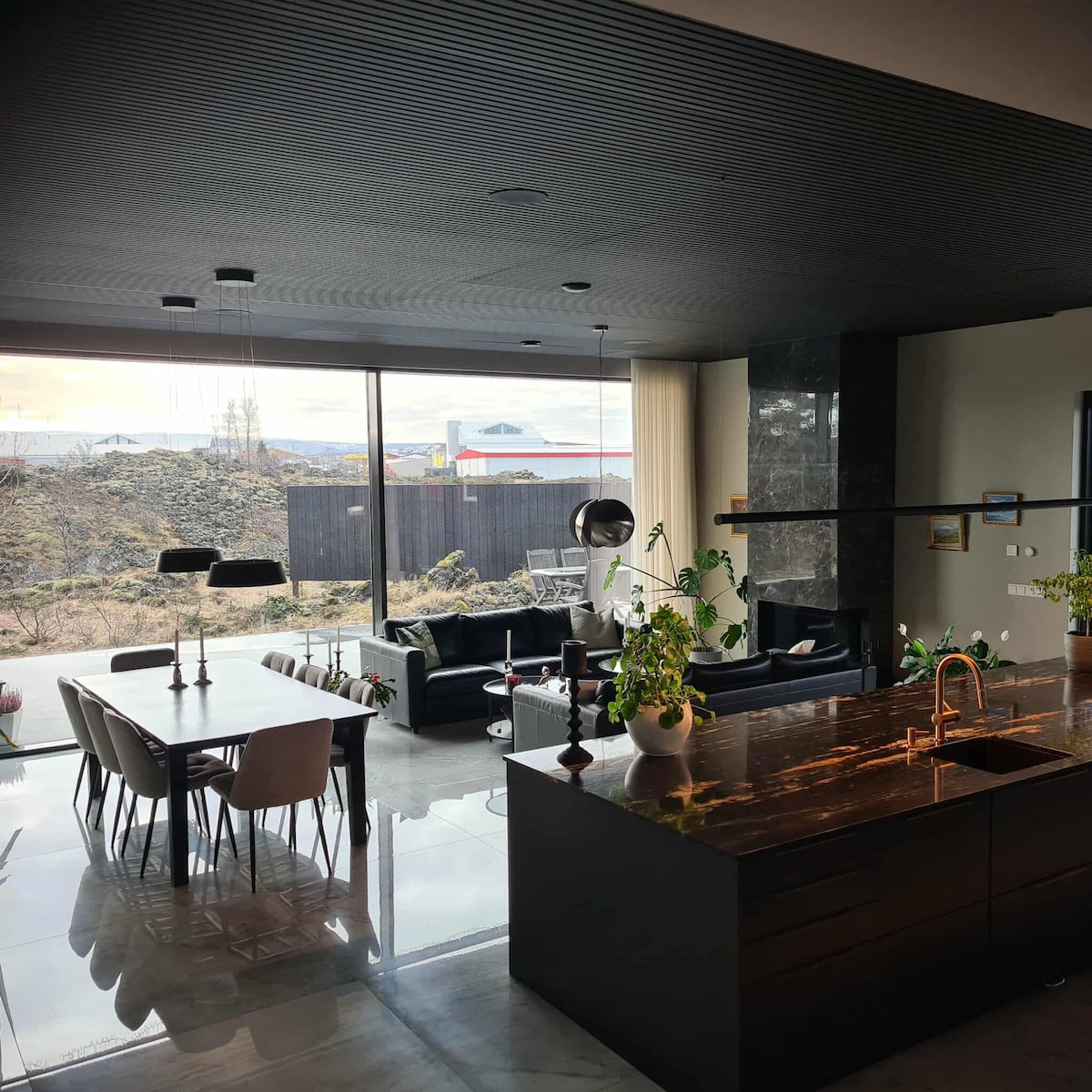 Luxurious space that exudes tranquility. Surrounded by mountains and a lush green landscape house blends rustic warmth with modern minimalism. Bright and airy with almost 5m under ceiling and large framed glass windows it offer unabated views of the world outside. Perfect location for exploring west Iceland, relaxing getaway with family and friends, romantic holiday, honeymoon, a place to disconnect from busy world. Private spa with sauna, hot tub for up to 7 person and cold plunge.