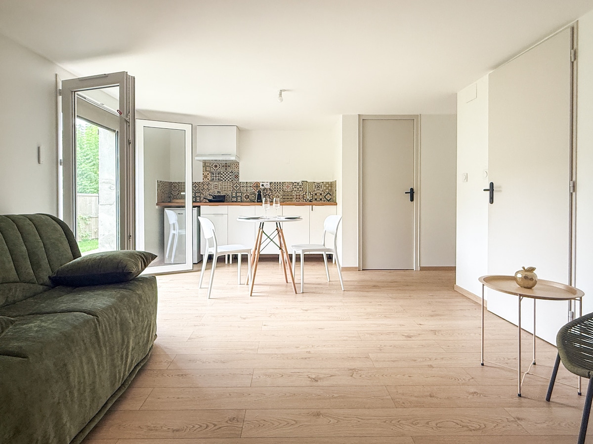 Földszinti stúdió kerttel és biztonságos parkolóval