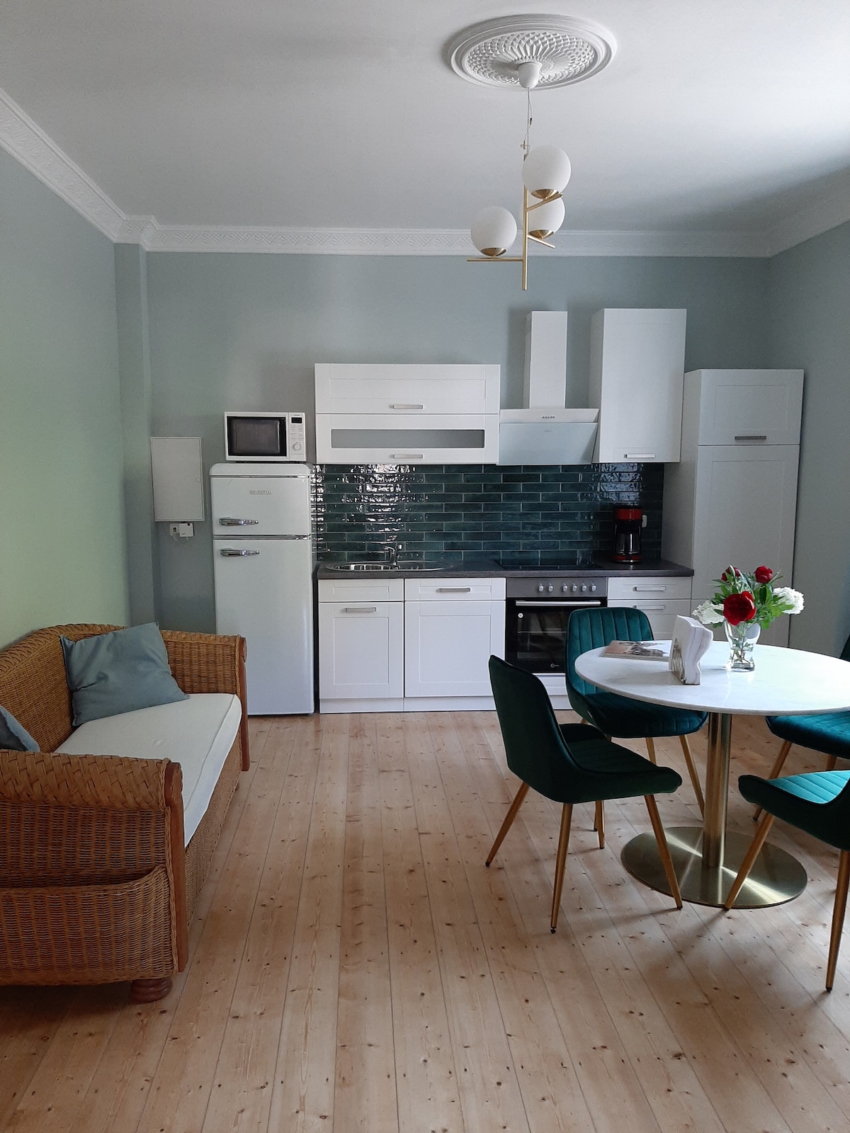 Stílusos, világos lakás történelmi természeti ingatlanon, mégis közel a városhoz. A tájrezervátum közepén, amelyet erdő és rét vesz körül, a 16. századból fekszik az idilli ingatlan. A galériával rendelkező nyitott lakás 4 főnek elegendő helyet biztosít 4 fő számára. Saját bejárattal és terasszal rendelkezik, és az udvari központ épületének 1. emeletén található. A világos konyha-nappali antik bútorokkal és praktikus teakonyhával várja, hogy főzz, egyél és találkozz.