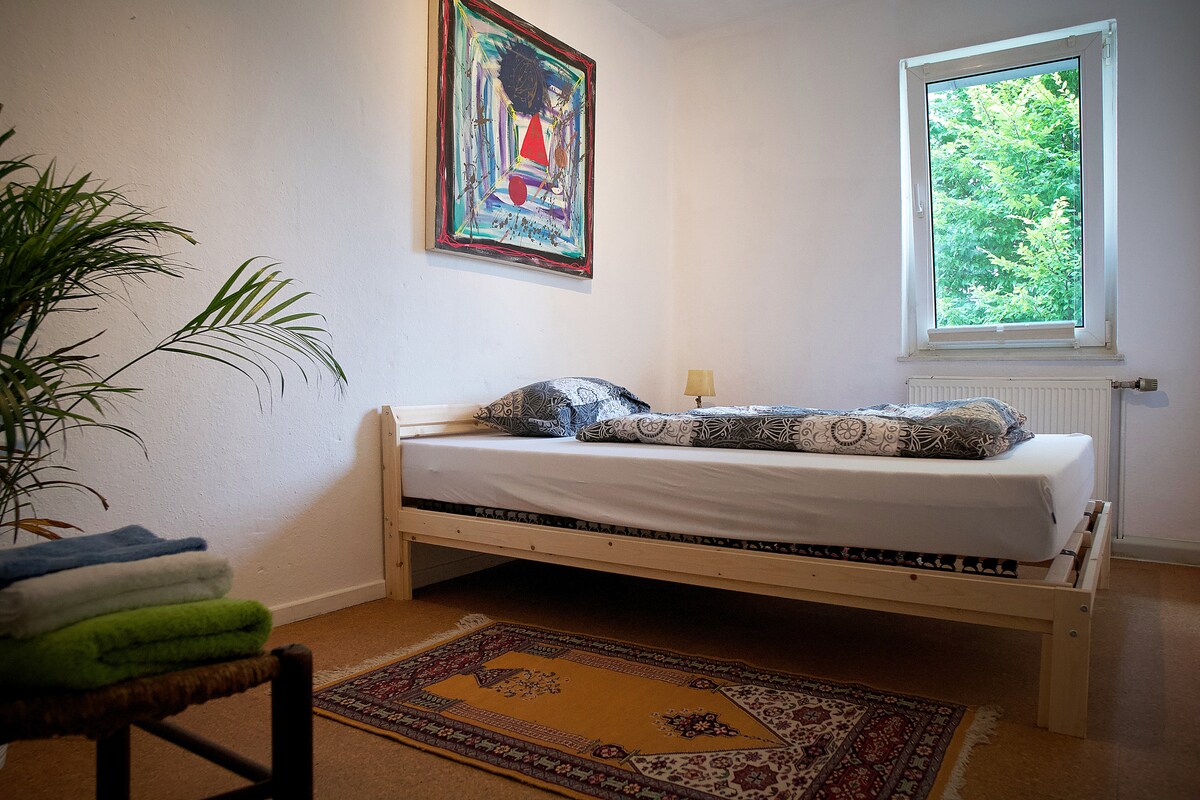 Vidám színek és meleg faárnyalatok hatják át ezt a nyitott és világos lakást. Amikor reggel felébredsz, az első napsugarak átesnek a nagy ablakokon, és üdvözlik a napot. Amikor pedig borús az idő, csak helyezd magad kényelembe a fatüzelésű kályha melletti kanapén. A kétszemélyes ággyal és emeletes ággyal rendelkező hálószoba nagy, régi tolóajtókkal választható el. Keddtől vasárnapig reggeli a kávézónkban/bisztrónkban. Szauna, Ebike kölcsönzés