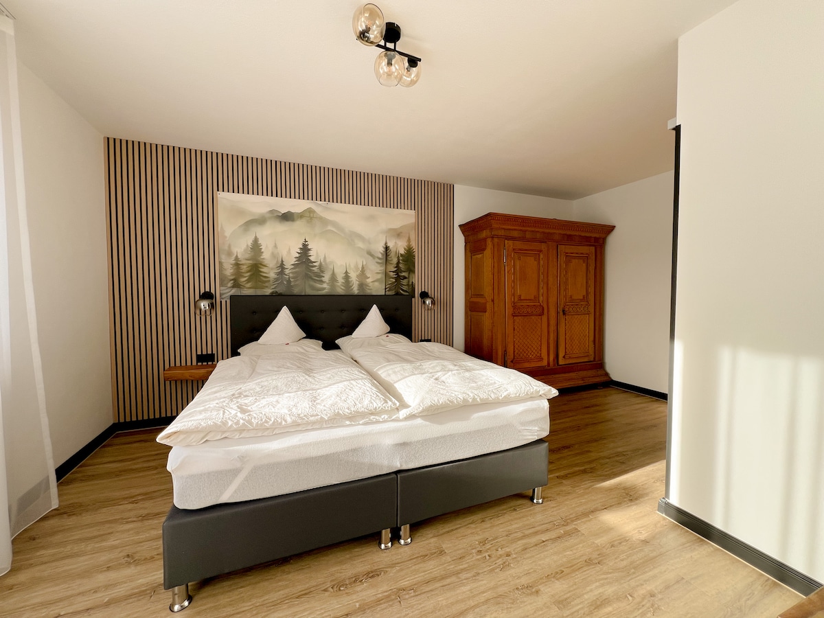 Tágas lakás 4 hálószobával, 2 fürdőszobával, nappalival és konyhával a saját házadban ( nem a főházban), erkéllyel egy nagy ingatlanon ( kerti használat grillezővel) Adenauban. Sétálj 5 percre a városközponttól és számos pékségtől, kávézótól, szupermarkettől, étteremtől és mindössze 2 km-re Breidscheid Nordschleifene bejáratától. Az ingatlan nagyon nagy, és teherautók vagy pótkocsik számára is rendelkezésre állnak parkolóhelyek.