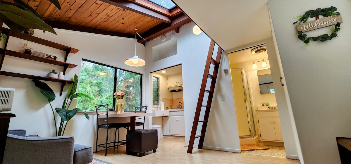 A nyugodt, szőlővel borított udvarban elidőzöl egy kávé mellett ebben a Berkeley-ben található, félreeső házikóban. A ropogós fehér lepedők, kézműves bútorok és festett fából készült burkolatok kifinomult, mégis rusztikus menedéket nyújtanak. A főszoba hangulatos, nagy tetőablakkal, kényelmes franciaággyal, forgószékkel, valamint íróasztallal és székkel. Van egy kis teakonyha. Kívül egy kőterasz, egy hinta pad, amely egy koi tóra néz, és egy kis szabadtéri asztal és székek. ZCSTR2021-0842