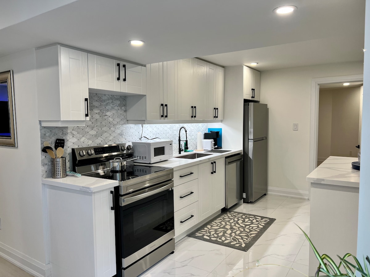 Üdvözlünk a modern, vadonatúj 2Br, 2Ba alagsorban Richmond Hillben! Ideális családok vagy csoportok számára, stílusos lakóterülettel, mosóterülettel és jól felszerelt teakonyhával büszkélkedhet. A fő hálószoba kandallóval és hozzá tartozó fürdőszobával rendelkezik, míg mindkét hálószoba king-size ágyakkal és tágas tárolóval rendelkezik. A szórakozáshoz TV, Wi-Fi, Netflix és Amazon Prime tartozik, egy fényűző környéken, mindössze 5 perces sétára a Yonge St-től és a buszpályaudvartól a könnyű megközelíthetőség érdekében. Tapasztald meg a kényelmet