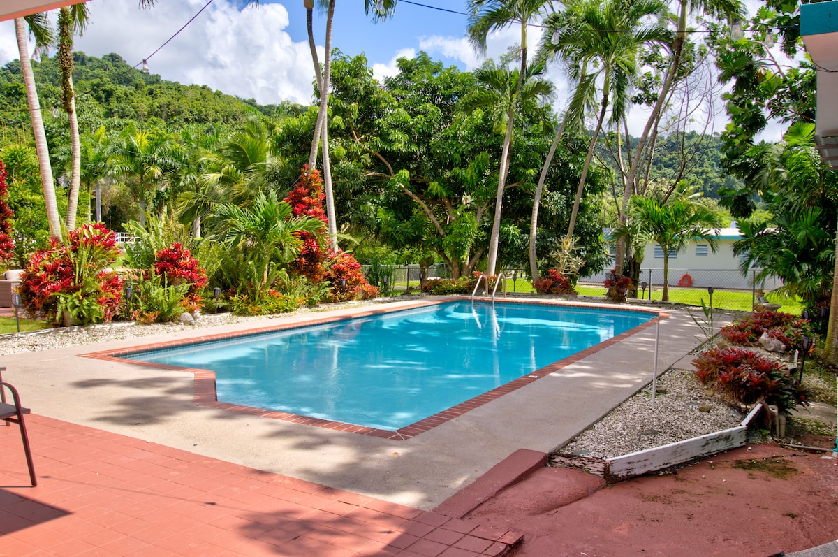 Una propiedad exclusiva para sus huéspedes sumamente espaciosa con 4,500p2. Que cuenta con 3 habitaciones, 3 baños completos, sala, comedor, cocina, marquesina, piscina, área de terraza, estacionamiento amplío para 10 a 15 automóviles. Completamente remodelada. Propiedad rodeada de vegetación, montañas, ríos y hermosos paisajes. A seis minutos del rió Hippie, a diez del Yunque National Forest Naguabo. Un lugar hermoso para explorar, una aventura diferente.