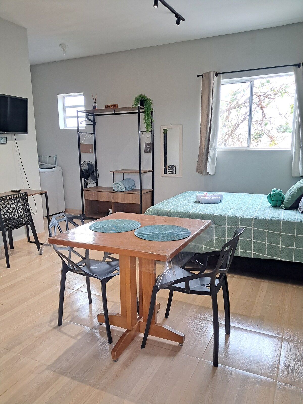 Estamos em um bairro bem tranquilo, residencial e arborizado, porém sem muitos comércios ao redor. O espaço tem outras kitnets, por isso, aglomerações e sons altos não são permitidos. O espaço foi preparado com muito carinho e espero que meus hóspedes tenham uma boa experiência e se sintam em casa. 5 minutos da Rodovia do Açúcar 15 minutos do centro 15 minutos da rodoviária 20 minutos da rua do Porto 20 minutos da ponte Pênsil 40 minutos do Thermas Water Park obs: distância de carro