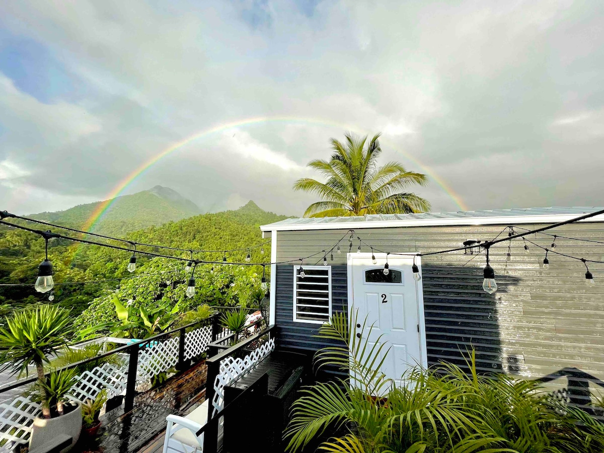 Ez a 10'x16' önellátó miniház egy egyedülálló hely a hegyen, ahol mindent megtalálsz, amire szükséged van az otthonodtól való kikapcsolódáshoz. A nemzeti esőerdőre és partvidékre nyíló kilátás elképesztő. A Sonadora patak a 7,5 hektáros hátsó udvarral határos, és az ingatlan számos ösvényén keresztül érhető el. A kis konyha teljesen felszerelt az Ön kényelme érdekében. 29 perc alatt elérhető a kompterminál a Vieques/Culebra, 28 perc a Seven Seas és 41 perc El Yunque.