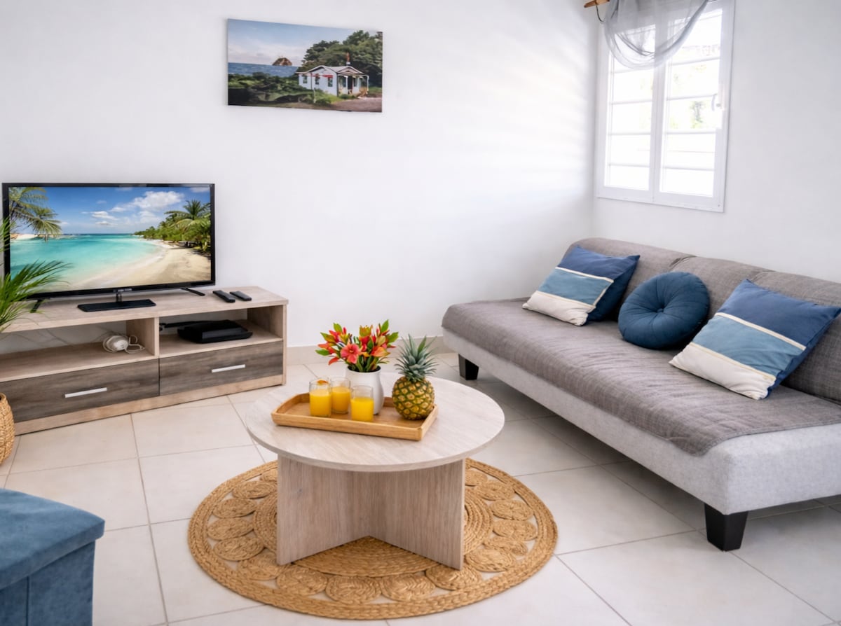 Charmant bas de villa avec grande terrasse en campagne. Idéalement situé, à seulement 10 minutes de la plage de l’Anse Figuier, ce logement est parfait pour des séjours en couple, en famille ou entre amis. En pleine nature, cet hébergement offre un cadre paisible propice à la détente et aux moments de qualité. Un intérieur moderne, convivial. Des chambres cosy alliant simplicité et confort. Une grande terrasse pour des repas en plein air ou vous relaxer dans ce cadre verdoyant