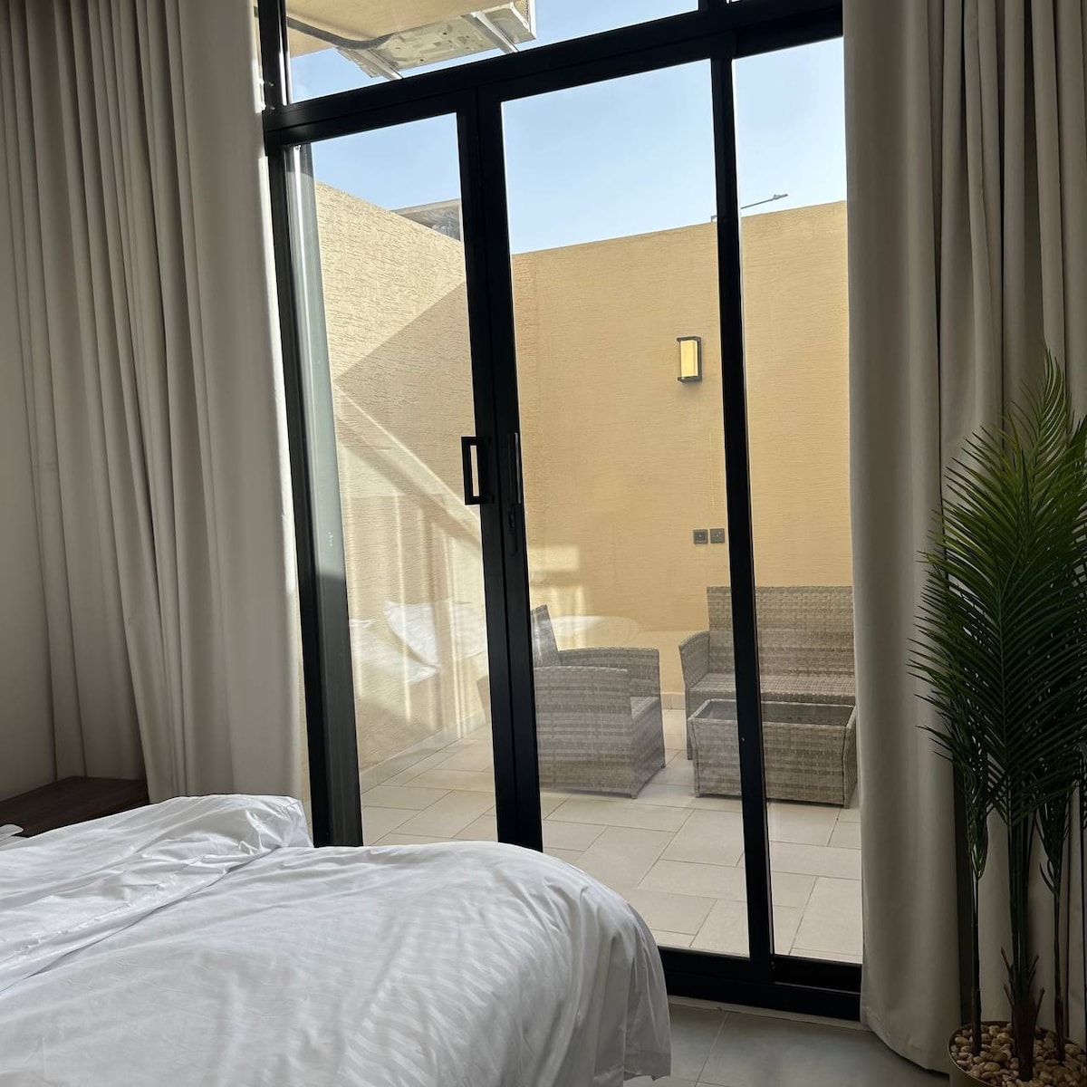 Elegáns stúdió teljes magánszférával és intelligens önálló bejárattal, egyedi dizájnnal, kényelmes színkeverékkel és csodálatos szállodai szolgáltatásokkal, valamint egy gyönyörű kilátással rendelkező szabadtéri ülőhellyel és egy különleges grill sarokkal, amely lehetővé teszi, hogy élvezze a szabadtéri udvart, valamint egy kis oldalsó konyhával, amely hűtőszekrényt, vízforralót, mikrohullámú sütőt és felszíni sütőt tartalmaz, az Aqeeq kerületben található, stratégiai helyen, nagyon közel a Riyadh Boulevard-hoz, a repülőtérhez, az éttermekhez és számos közeli és különleges rendezvényhelyszínhez.