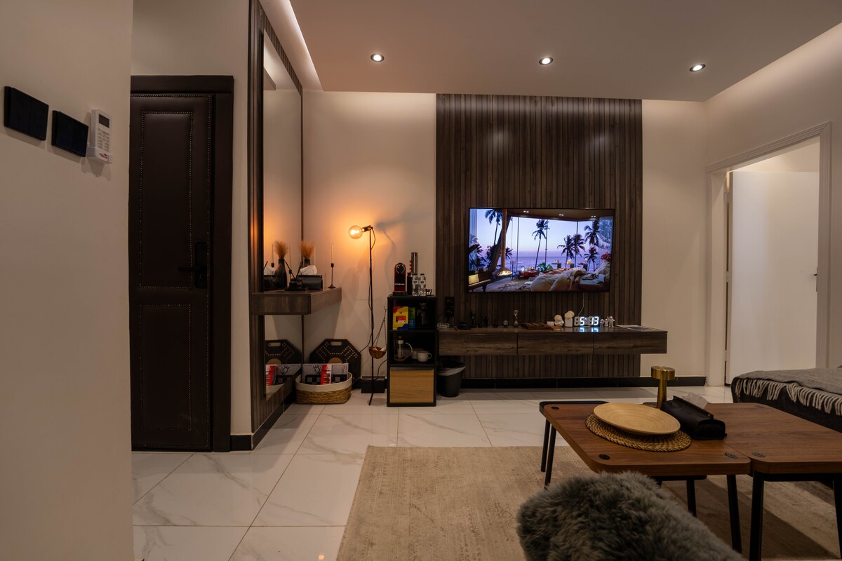 Csendes és stílusos, saját érdekeltségű stúdió, amely egy főágyból, egy oldalsó ülőhelyből, okostévéből, valamint egy kávés sarokból áll, ahol kávét, teát, vízforralót, mikrohullámú sütőt és egy fürdőszobát találsz, tele fürdőeszközökkel. Ez a stúdió stratégiai helyen található Rijád északi részén, közel minden szolgáltatáshoz és eseményhez, nincs Wi-Fi. A Riyadh Boulevard 5 percre található Walnder Gunn 8 perc , A repülőtér 18 perc alatt elérhető