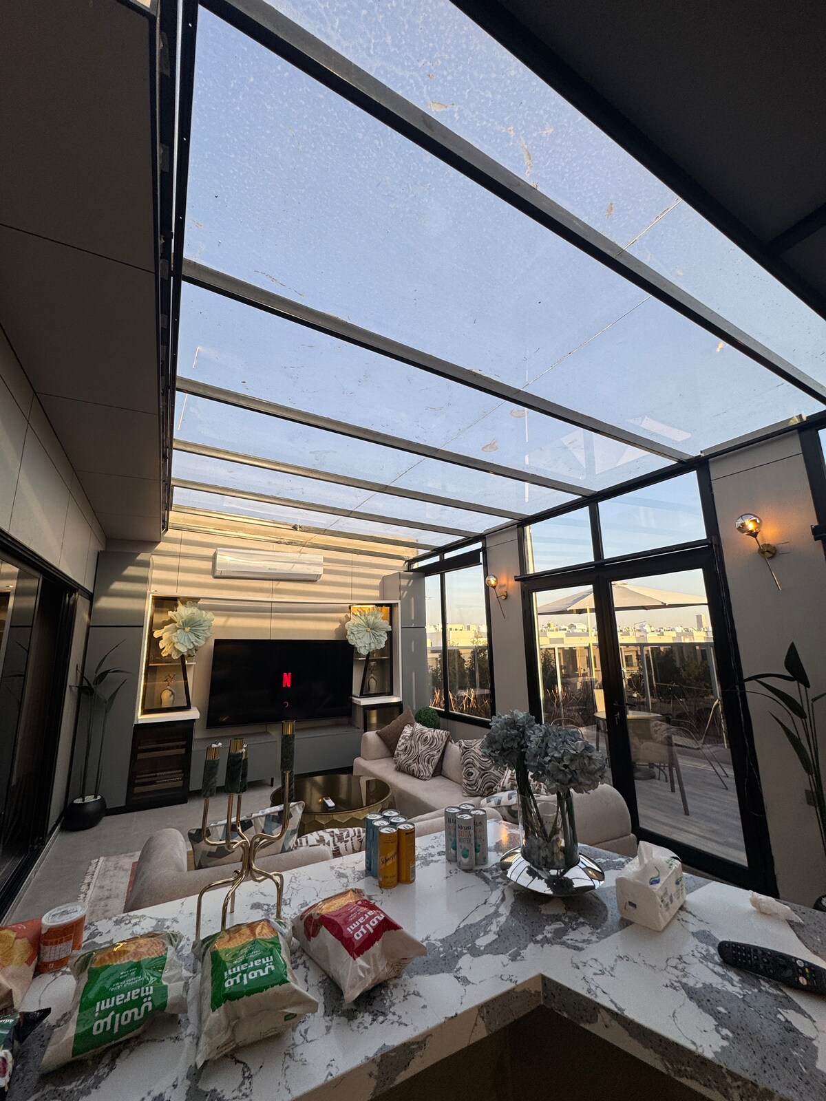 Luxus két hálószobás apartman privát tetőtéri jakuzzival Al Malqában, Észak-Rijádban. Élvezd a stílusos szálláshelyet, amelyen 75 hüvelykes QLED Smart TV található Netflixszel, Disney+-szal, Shahiddal és OSN-nel. A tetőteraszról gyönyörű kilátás nyílik, kinti ülőhelyekkel és hűsítő párarendszerrel a frissítő légkörért. Nagy sebességű optikai Wi-Fi, kávéfőző, elektromos sütő és önálló bejutás. Tökéletes pároknak és pihentető tetőtéri estékhez.