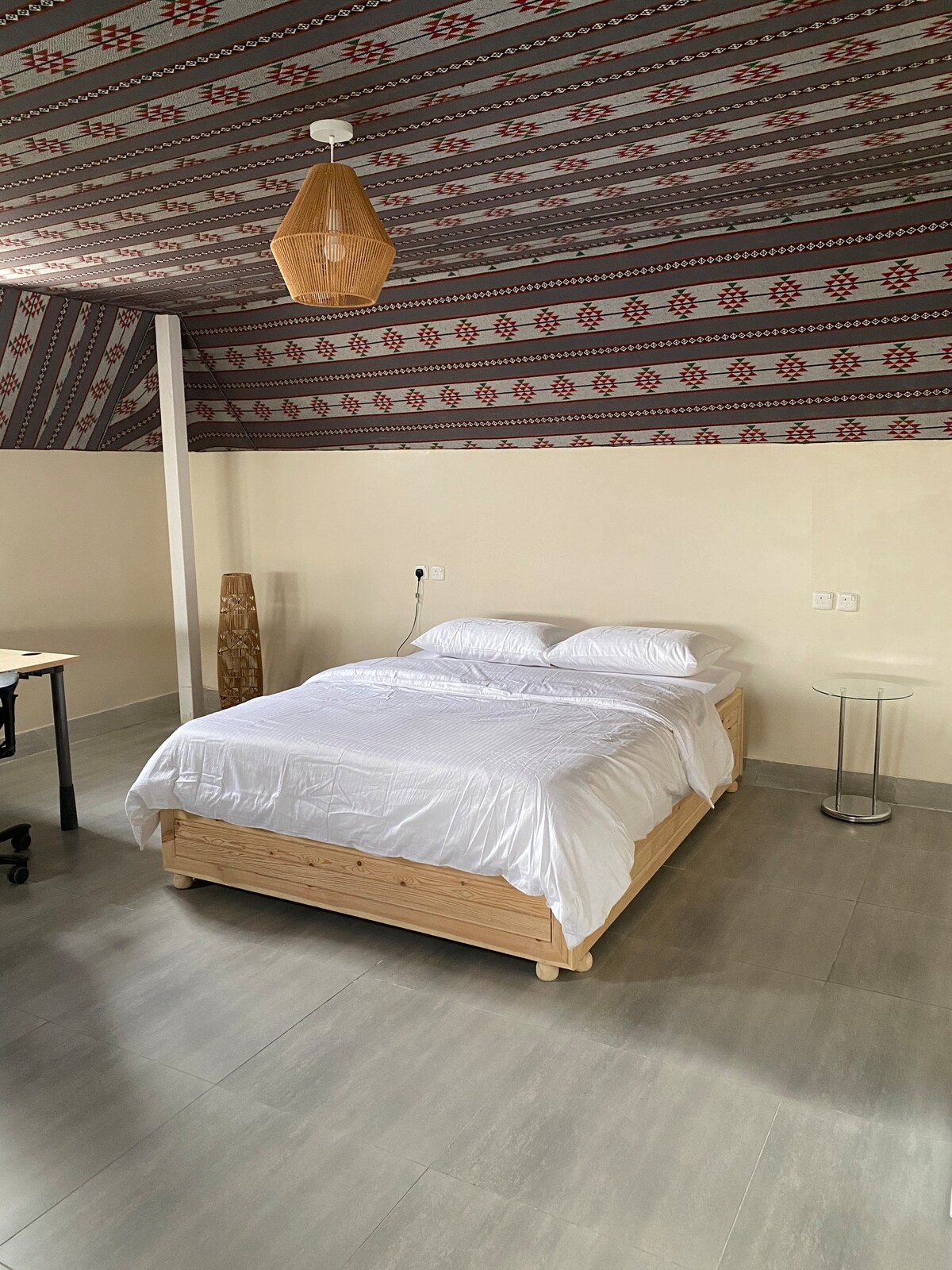 Elegáns stúdió teljes magánszférával és intelligens önálló bejárattal, egyedi dizájnnal, kényelmes színkeverékkel és csodálatos szállodai szolgáltatásokkal, valamint egy gyönyörű kilátással rendelkező szabadtéri ülőhellyel és egy különleges grill sarokkal, amely lehetővé teszi, hogy élvezze a szabadtéri udvart, valamint egy kis oldalsó konyhával, amely hűtőszekrényt, vízforralót, mikrohullámú sütőt és felszíni sütőt tartalmaz, az Aqeeq kerületben található, stratégiai helyen, nagyon közel a Riyadh Boulevard-hoz, a repülőtérhez, az éttermekhez és számos közeli és különleges rendezvényhelyszínhez.