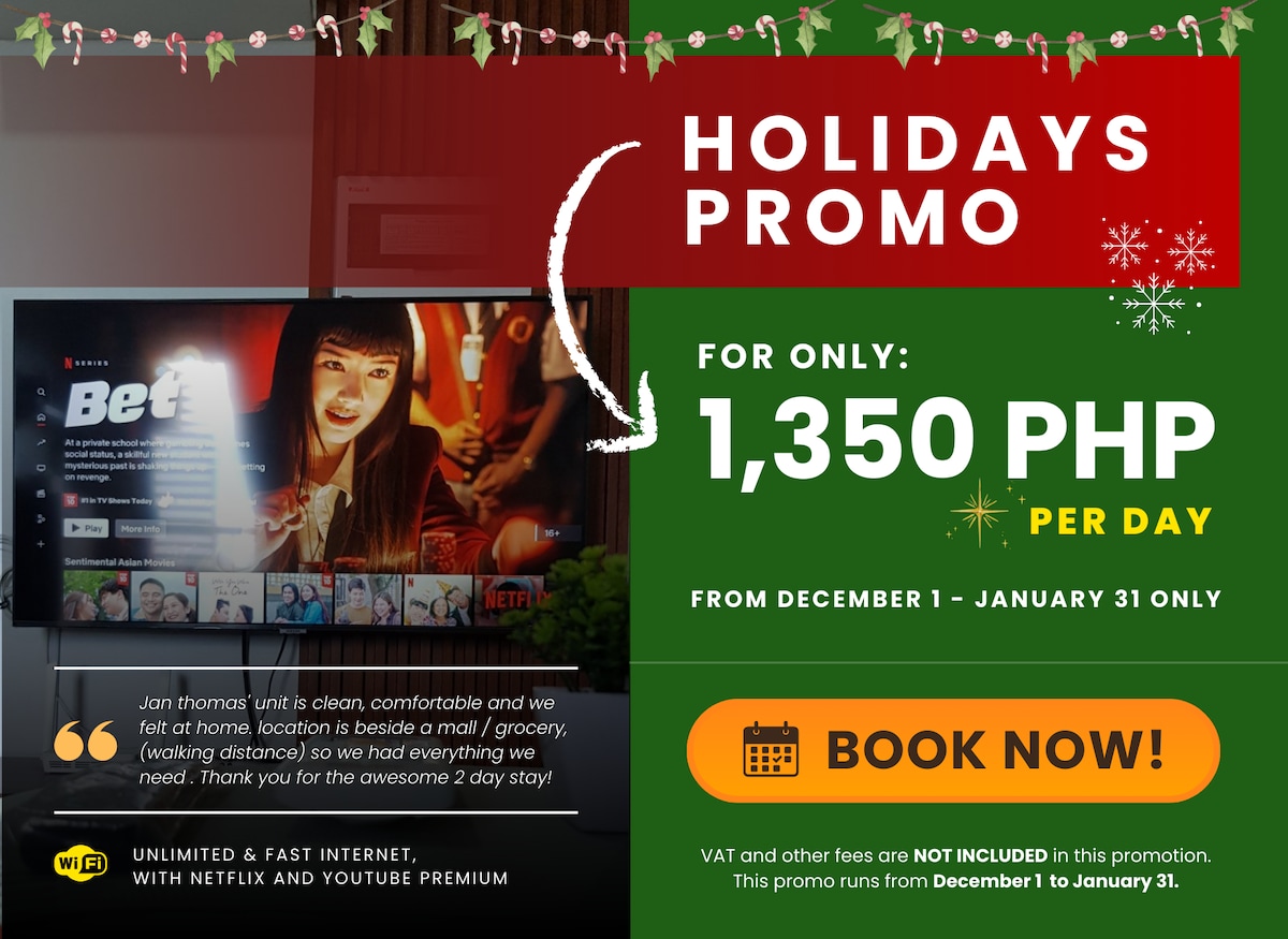 Pihenj az egész családdal ezen a békés szálláshelyen. 50 négyzetméteres 2 hálószobás sarokegység, teljesen légkondicionált, 150 Mbps sebességű internettel, gyönyörű kilátás nyílik az Antipolo-hegységre az épület utolsó emeletéről, melegvizes zuhanyzó, 60 hüvelyk 4k nagy okostévé, automata mosógép és szárítógép, forró zuhanyzó, teljesen felszerelt konyha és kiváló minőségű ágynemű.