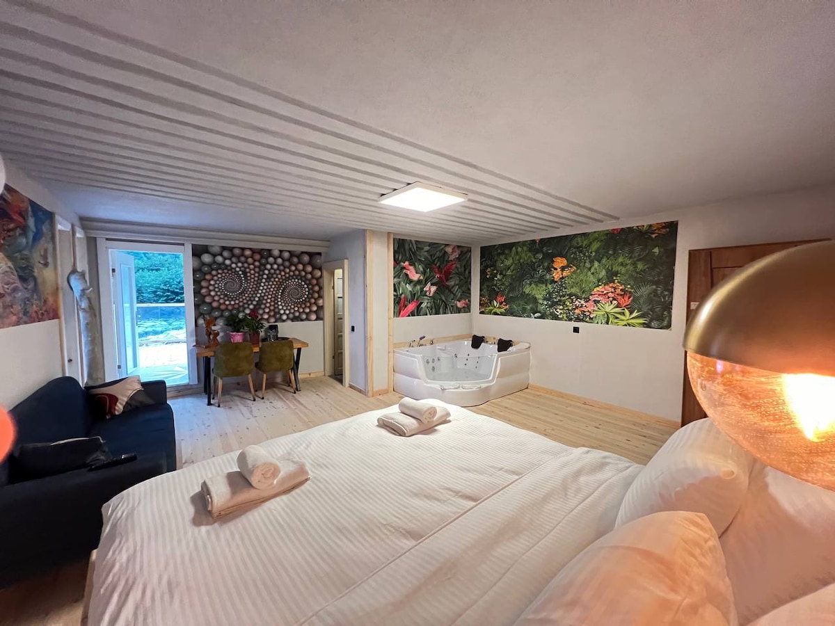 Üdvözöljük a Fenix Loftban – 120 m², közvetlenül elérhető saját lifttel. Ez az elegáns és nyitott loft hálószobával, tévészobával, étkezővel, irodával, felszerelt edzőteremmel és teljesen felszerelt konyhával rendelkezik. Saját hozzáférésed van egy csak neked fenntartott gyógyfürdőhöz is: fedett medence, pezsgőfürdő, szauna és gőzkamra. Ideális hely a kényelmet és a magánszférát ötvöző tartózkodáshoz, akár egy hétvégére párként, akár egy wellness-szünetre.