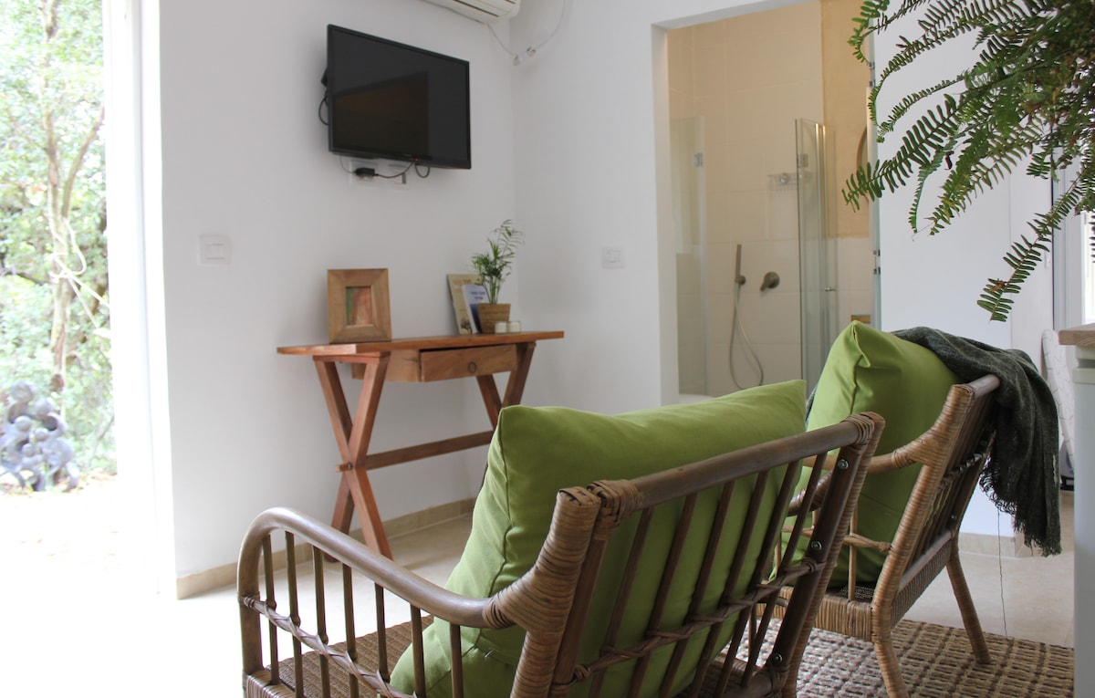צימר 17 מטר יש בוא הכל ! מטבח כולל כלים, מקרר , מכונת נספרסו, סיר בישול , מקלחת , וכו... לחובבי הקולנוע יש מקרן + מערכת סאונד + appleTV שכולל נטפליקס , סלקום TV לתוכנית .. מיטה של הולנדיה סופר נוחה שמתכווננת לספה במהלך היום ( 140/190 ) . עץ התאנה עוטף את בצימר ונותן אווירה קסומה . מתאים לזוג שמחפש שקט לסופ״ש ובכללי כולם מוזמנים (-: אפשר להגיע ללא פגישה ולהנות מ100% פרטיות ( self check in) בהודעה מראש