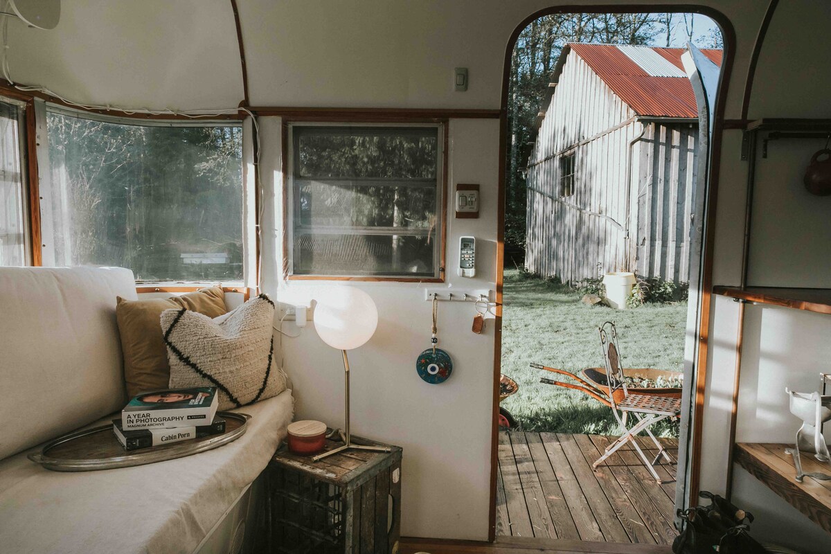 Airstream lakókocsi egy kannabiszfarmon – pezsgőfürdő