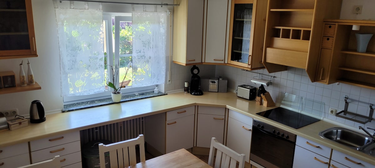 Geräumige Ferienwohnung mit drei Schlafzimmern: ein Elternschlafzimmer mit Doppelbett, ein Kinderzimmer mit Hochbett und ein zusätzliches Schlaf-/Ausweichzimmer im Souterrain. Ruhige Lage im Grünen, ideal für Familien, Paare oder Freunde. Entspannen Sie auf der Terrasse mit Grill oder genießen Sie die Aussicht vom Balkon. Der Bayerische Wald, zahlreiche Wanderwege und die Dreiflüssestadt Passau sind schnell erreichbar. Der separate Anbau bietet viel Privatsphäre.