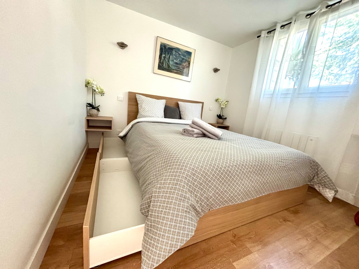 Charmant Studio meublé tout équipé de 35 m2 dans zone pavillonaire calme parfaitement sécurisé. Ideal pour les longs et courts sejours des professionnels. Salle Arena Grand Paris (10 min), Circuit Carole (10 min) , Aéroport CDG (15 min), Parc Astérix (20 min), Disneyland Paris (30 min), Val-d'Europe (30 min) Parc des Expositions villepinte (15 min), Palais des Sports G.Prudhommme (1km) Wifi haut débit, smart TV, machine à laver, lave-vaisselle, Cafetière, Bouilloire, Gazinière, frigo/congé