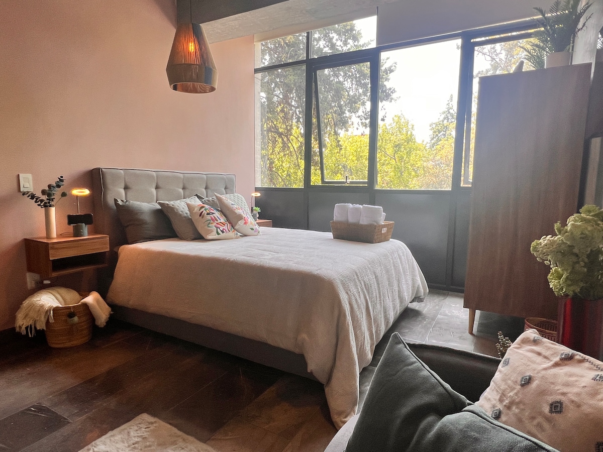 Departamento nuevo en tres niveles con espléndida vista a un bello jardín mexicano-andaluz. Dos amplías camas, dos baños completos, cocina equipada, comedor y una cómoda sala. Muy tranquilo y silencioso pues se encuentra protegido por cuatro frondosos arboles del jardín. El barrio de Santa María se ha posicionado en el gusto de la gente joven, hay una amplia gama gastronómica y es una colonia aledaña al Centro Histórico, a 10 minutos a pie del metro San Cosme, a 4 estaciones llega al Zócalo.
