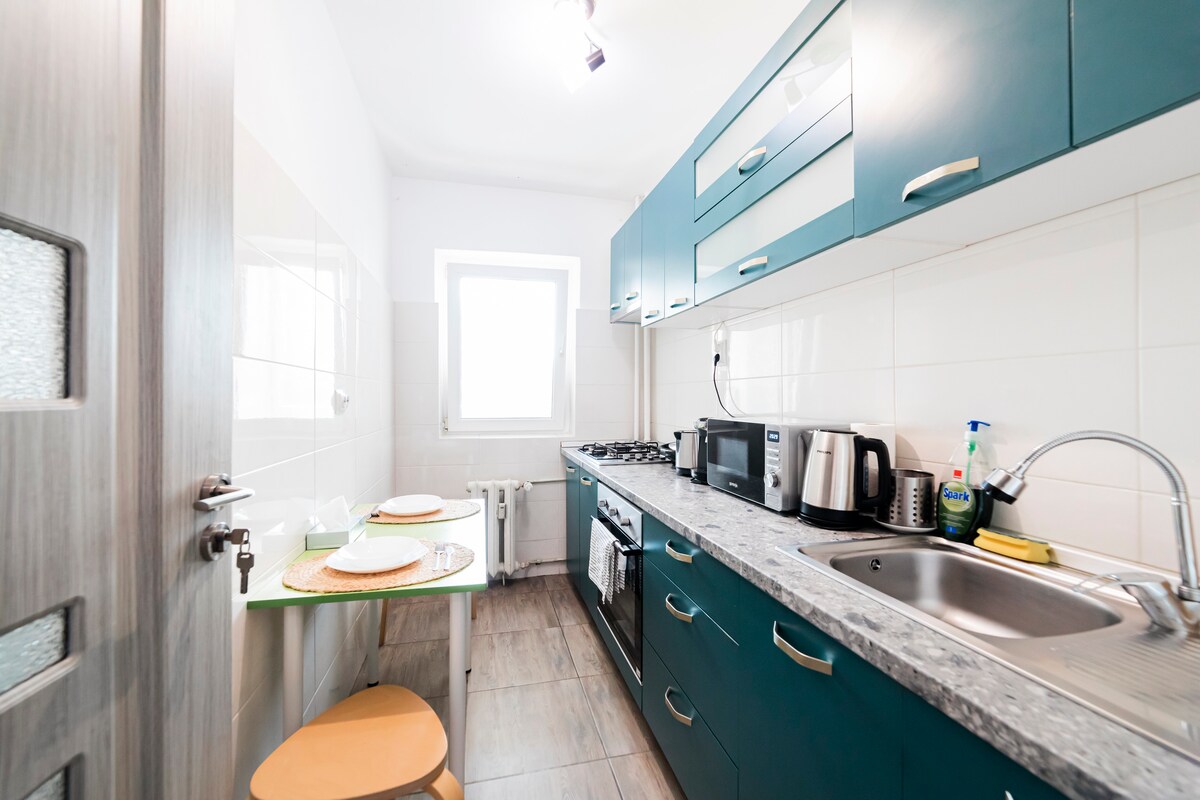 Comfortable and modern apartment with stunning view from the balcony, located close to the city center (1 minute away from Mihai Bravu subway station), with a rooftop garden and free gym for all guests. Free parking on building premises. The apartment is equipped with floor heating and all the necessary amenities: - Laundry room - HD Smart TV (Netflix included) - Coffee machine - Clothing Iron - Hangers - Clean bed sheets - Towels - Cleaning products - Cutlery - Plates - Glasses - Pans & pots