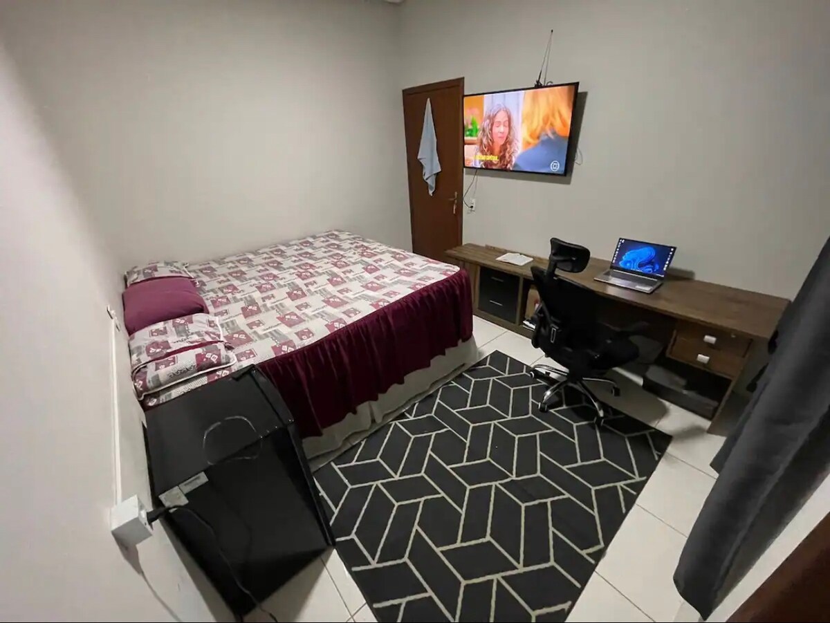 Vc irá estar perto de tudo ao ficar neste lugar, bem-localizada. A casa conta com: 2 - quartos de casal sendo uma Suíte - com Cama Super King, TV-65 Smart, Wi-Fi, Ar, escrivaninha, chuveiro elétrico - Sala - Sofá - Cozinha - fogão 1 - Geladeira, Micro-ondas. - liquidificador- chapa de lanche Lavanderia - Máquina Centrífuga - Garagem coberta, Ótima localização, próximo ao estádio, pq de exposição, shopping, farmácia, posto de combustível, mercado, pizzaria. Incluso: Água, Luz, Gás, Internet.