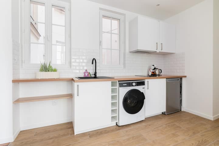 Üdvözlünk ebben a kiváló, 45m2-es lakásban, az av Jean jauresben a 19. kerületben, egy éttermekkel és bárokkal teli nyüzsgő terület szívében. Ez a liftes, 3. emeleti lakás, amely akár 4 fő elszállásolására is alkalmas, felejthetetlen szállást kínál. A Jaurès metróállomás az épülettől a földszinten található.