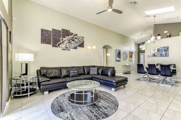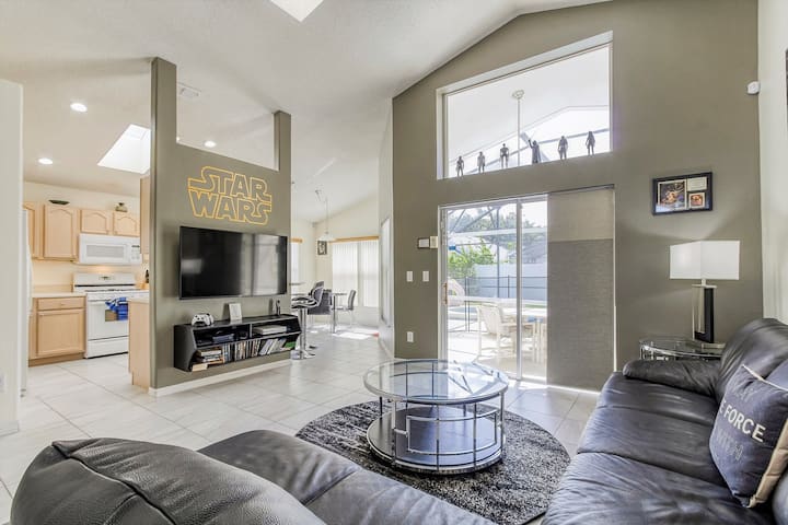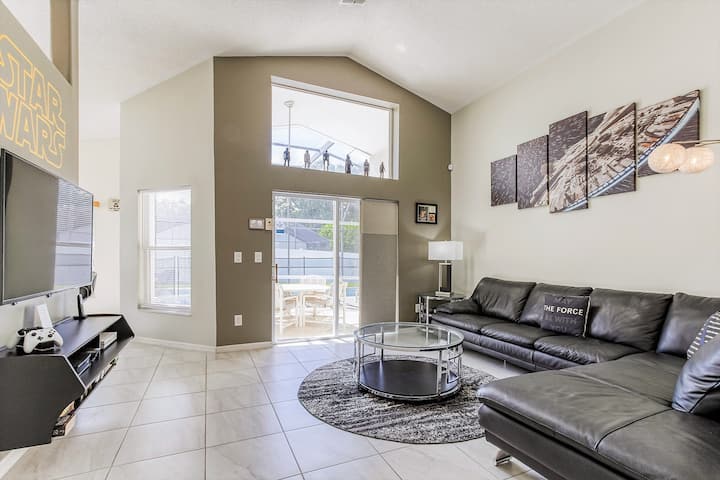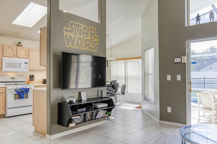 A Jabba the House egy elképesztően klassz Star Wars témájú villa! Nem csak A gyerekszobák, hanem AZ EGÉSZ VILLA STAR WARS TÉMÁJÚ!!! A Jabba the House egy gyönyörű nyaraló 5 percre a Walt Disney Worldtől a napsütötte Kissimmee-ben, Floridában. 4 hálószobával és 3 teljes fürdőszobával rendelkezik. Ez a tágas villa 8 embert tud elszállásolni teljes kényelemben. A nagyszerű szoba egy nagy, kombinált nappalival és étkezővel büszkélkedhet, amely a közeli konyhára és reggelizőhelyre nyílik. A déli fekvésű, gyógyfürdővel rendelkező úszómedence egy privát medencefedélzeten található, amelyet egy szúnyogháló és egy privát kerítés vesz körül. Játékszoba nélkül egyetlen nyaraló sem lehet teljes, és ez sem kivétel, biliárdasztallal és csocsóasztallal. Fedezzük fel részletesebben az összes kényelmi szolgáltatást!